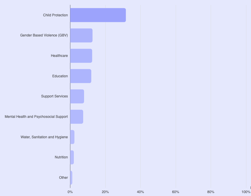 This data shows that the Alliance platform is used across a wide range of humanitarian sectors. The most frequent users are in child protection, but also have humanitarian workers from healthcare, gender-based violence, nutrition, and other sectors as well.