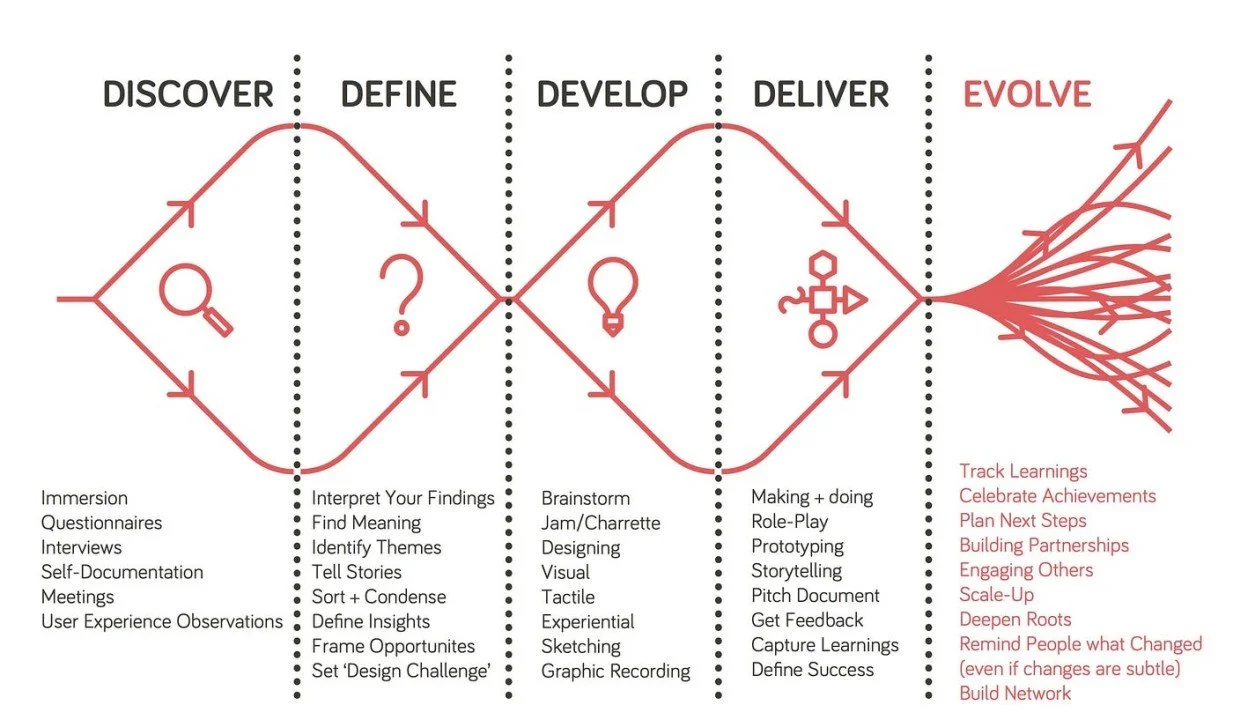 I used the double diamond design process and incorporated the key phases of Discovering, Defining, Developing, Delivering, and, of course, Evolving